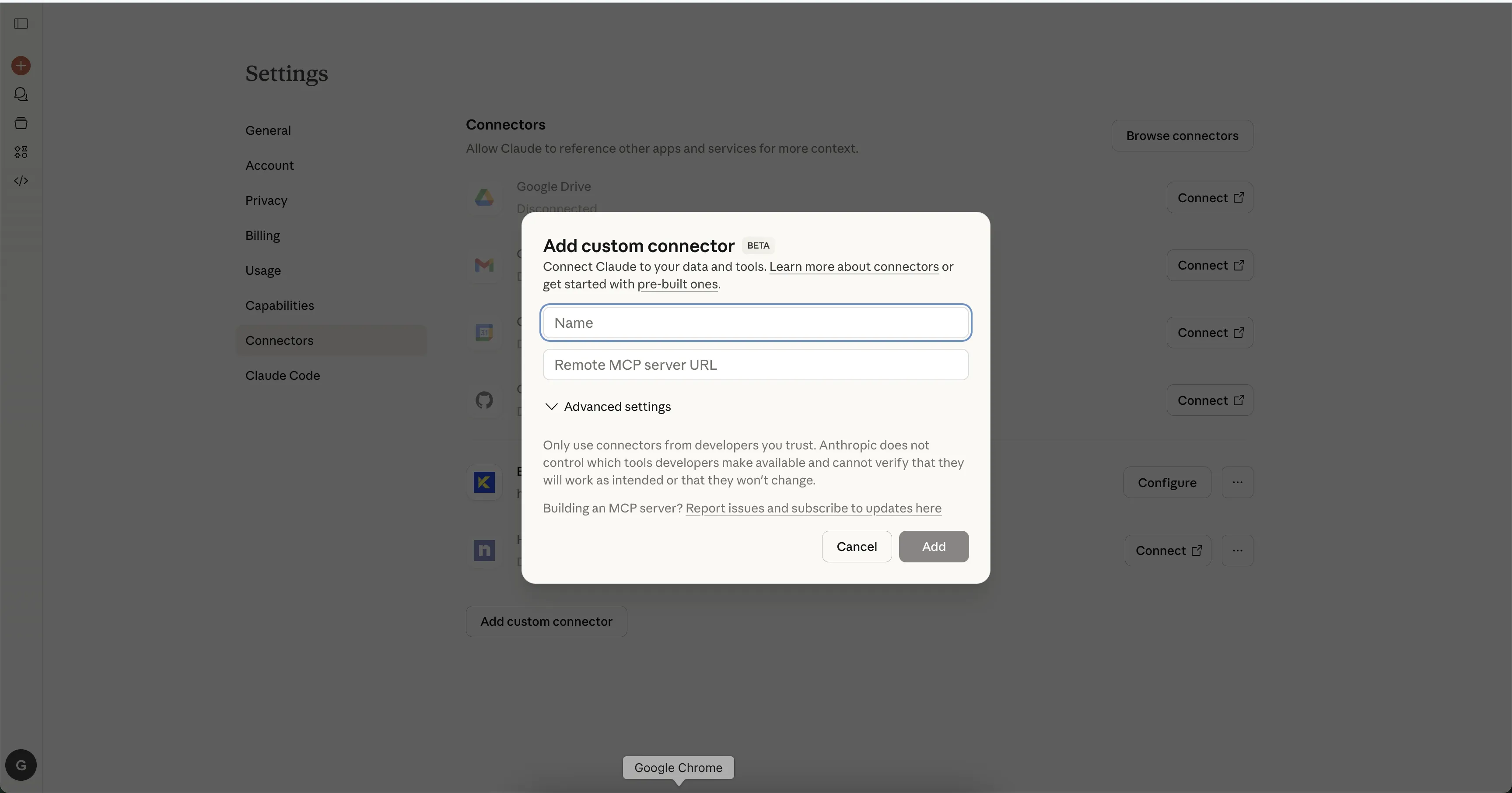 - Click "Add custom connector"